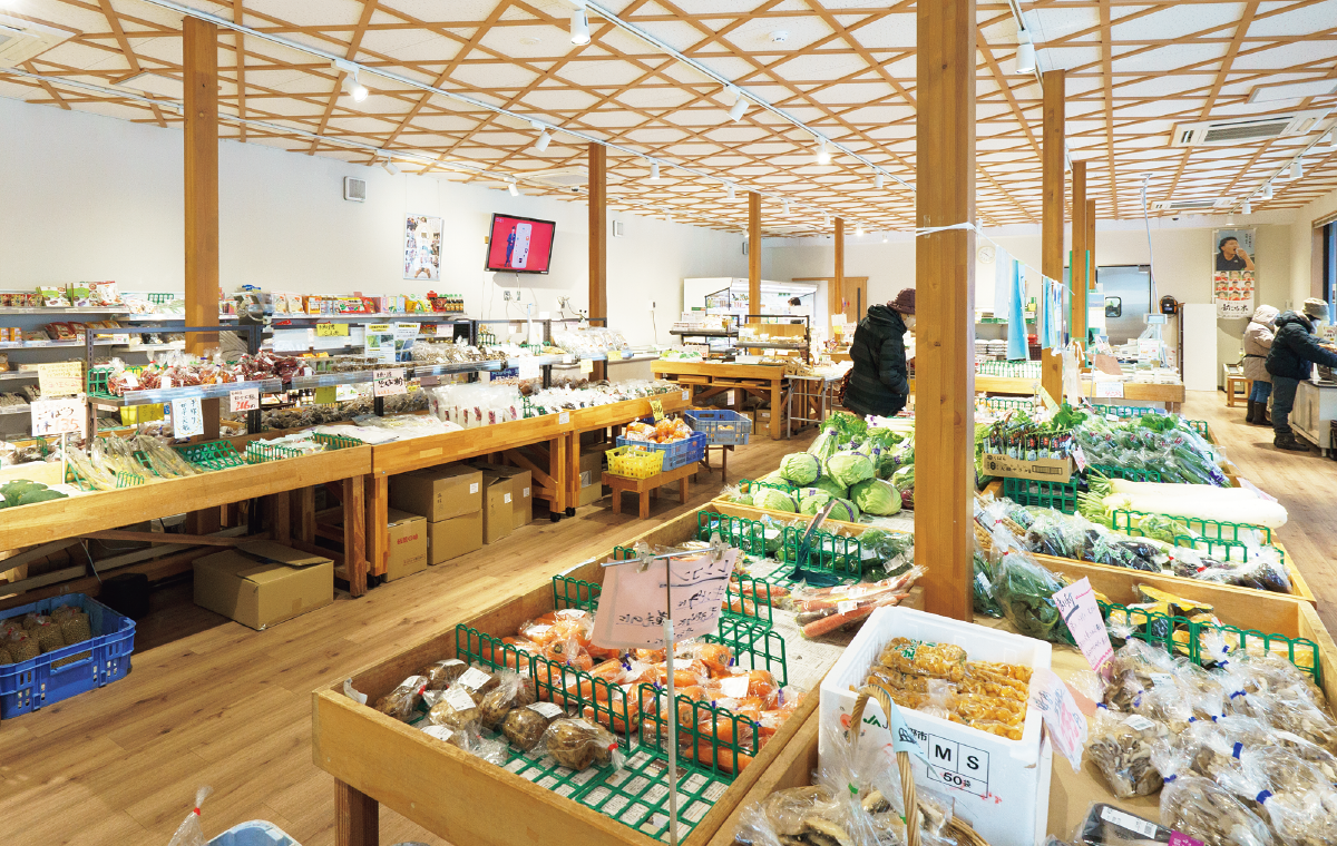 地域の生産者から届く季節の野菜が手頃な価格で並ぶ。小規模農家が多く、少しずついろいろな種類の野菜を作っていることから、バラエティに富んだ品ぞろえになる。夏はトマト、ナス、枝豆が豊富に。菌床栽培の肉厚なしいたけも定番商品。