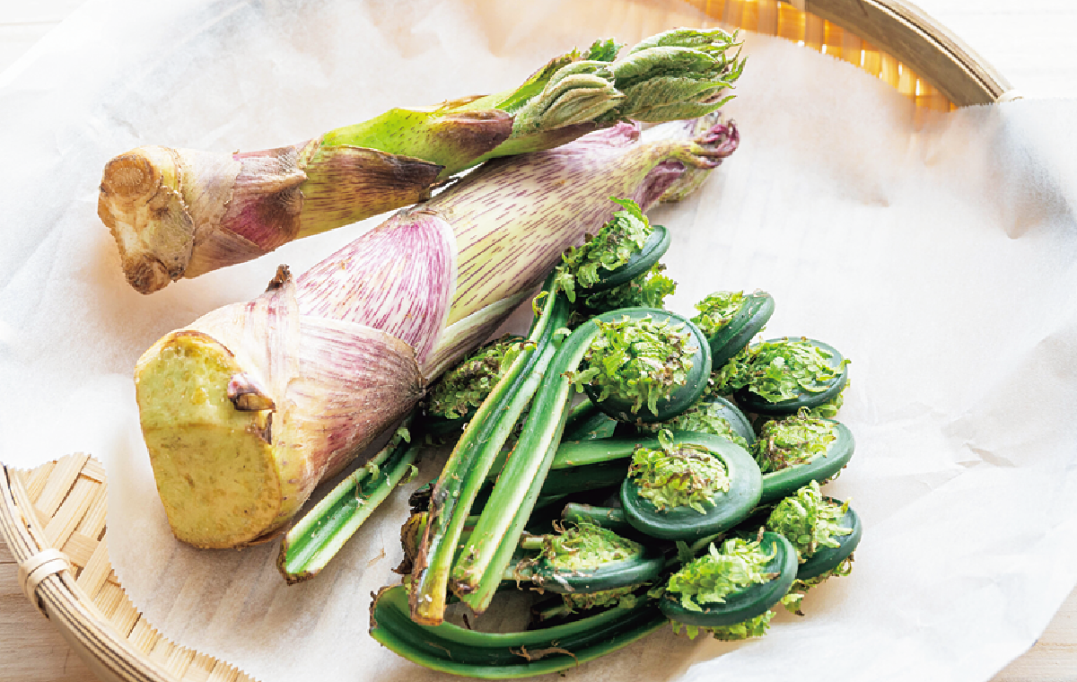 人気の山ウド、コゴミをはじめ、何十種類もの山菜が売り場に並ぶ。標高の高いところで採れるウドブキやナルコユリ(アマドコロ)といったレアな山菜も登場する。雪解けと共に出はじめ、最盛期は4~5月。