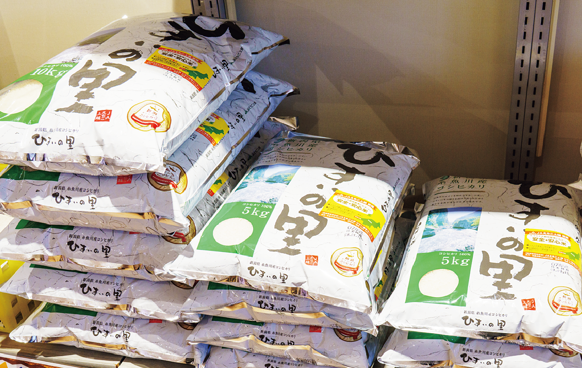 日本百名山の火打山や雨飾山をはじめ、2000m級の山々から流れる雪解け水で育てられた糸魚川産コシヒカリ。化学合成農薬と化学肥料を地域基準の半分に抑えた「エコライス栽培」で、食味の良さが自慢。