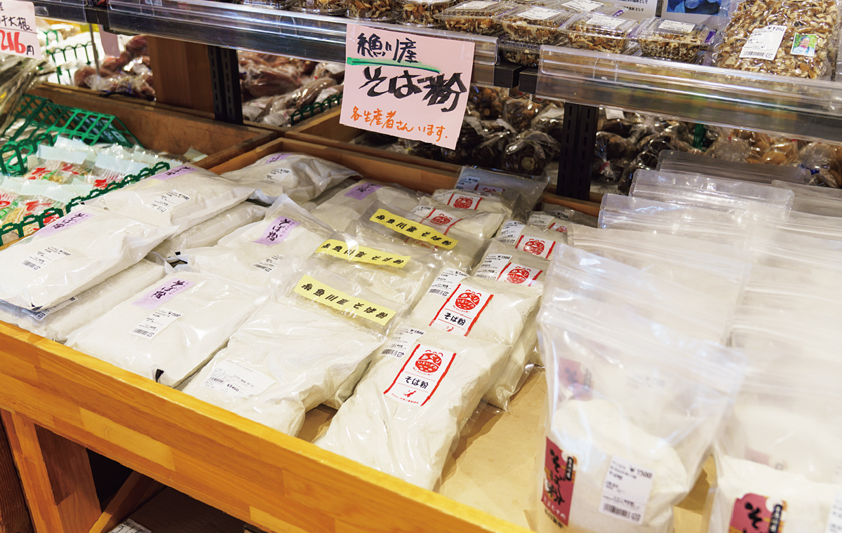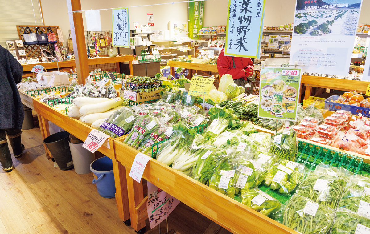 糸魚川エリアの食材が集まるひすい食彩館は、今年25周年。211名の生産者による新鮮な野菜や加工品が並ぶが、そのラインナップは県内の産直のなかでも特にバラエティに富んでいる。「野生イノシシ肉を使ったジビエ商品や、魚のお惣菜があるのは珍しいと思いますね。笹寿司をはじめ、お惣菜もこの土地ならではのものを楽しんでいただけます」と宮路一馬店長。春は山菜で売り場がいっぱいに。「糸魚川は海のイメージが強いかもしれませんが、実は山が多くて市内の面積の8割以上が森林。豊富な雪解け水と厳しい寒さに耐えた山菜は、種類が豊富で期間も長く、6月ごろまで並びます。春は山菜目当ての県外のお客様が増えますね」。夏はブランド野菜の越の丸なすやタカミメロン、枝豆が人気で、冬は雪にあたって甘みを増した白菜やキャベツ、ニンジンなどの糸魚川寒じめ野菜が登場。地場産そば粉や、乾燥ぜんまいの品揃えも豊富だ。糸魚川の豊かな食材をたっぷり楽しもう。