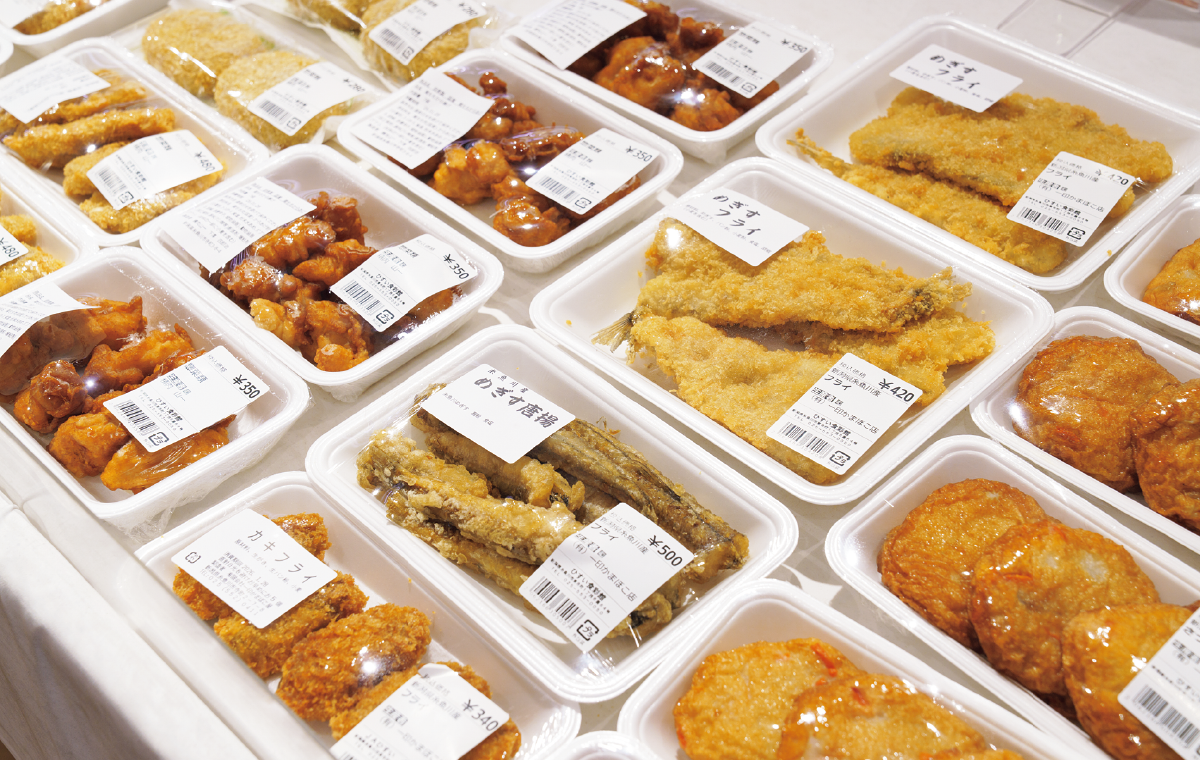 糸魚川で捕獲されたイノシシの肉で作られたソーセージやジャーキーが人気。また、地元の一印かまぼこ屋が作る糸魚川名物のかまぼこメンチも販売されている。メギスのフライやすり身揚げといった海の幸のお惣菜も要チェック。
