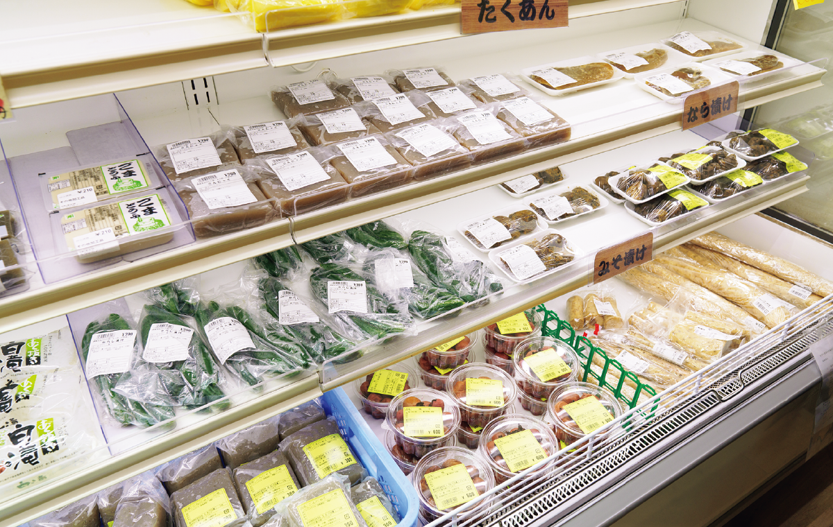 農家の皆さんの手による加工品も根強い人気。味噌漬け、奈良漬け、たくあんなどの漬物のほか、梅干し、かぐら南蛮味噌、手作りこんにゃくなど、ごはんのお供にしたいものがずらり。彩りが華やかな笹ずしやおこわなどのごはんものも並ぶ。