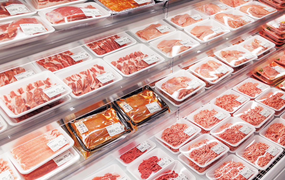 県産豚肉を中心に品揃えをしている精肉コーナー。ビタミンB1を多く含む豚肉は、夏バテ予防食材としても知られ、野菜売り場の夏野菜と合わせて料理をするのがおすすめ。今年、冷蔵庫の入れ替えを行い、お客様からは「お肉が一層おいしそうに見える」と好評。