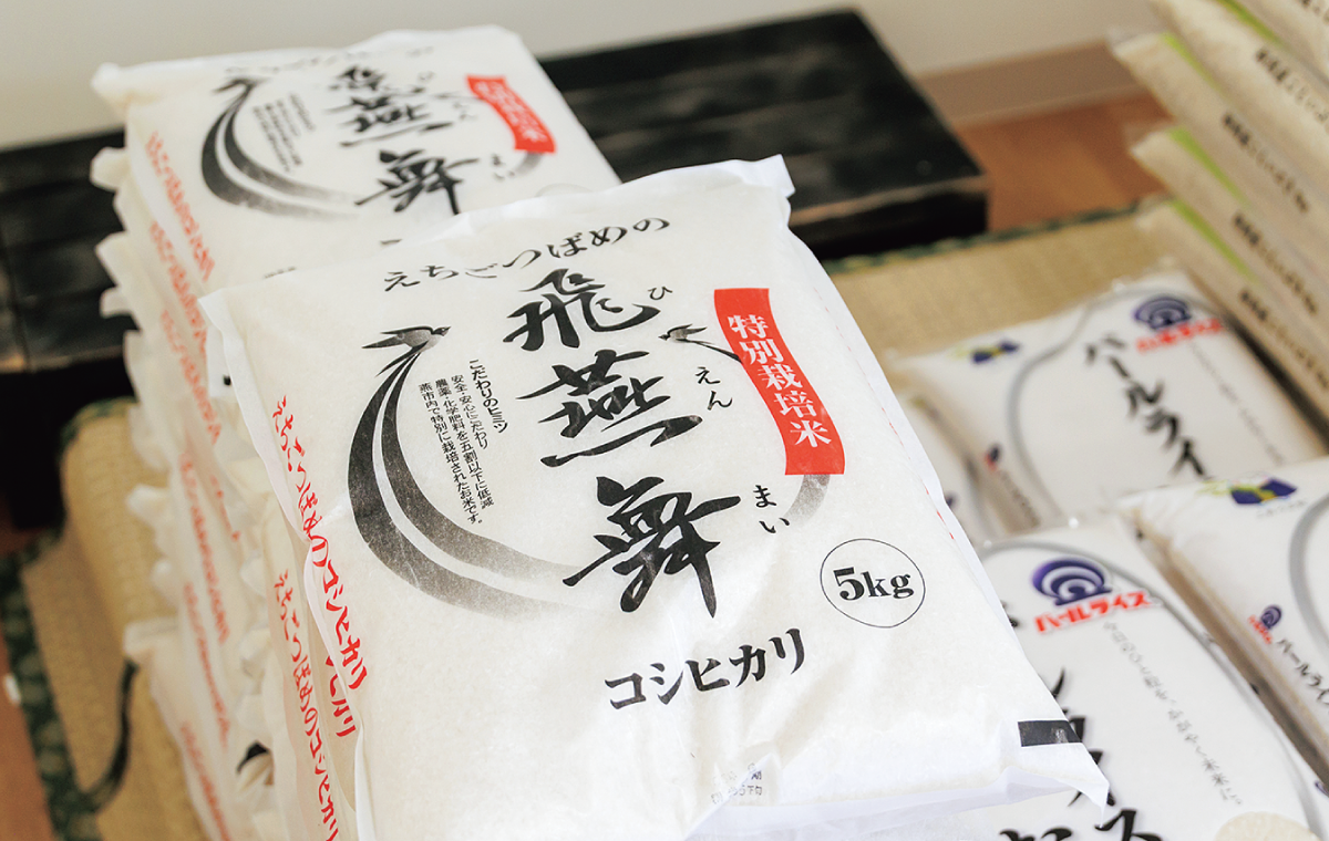 飛燕舞は燕市産の特別栽培米コシヒカリ。農薬・化学肥料を5割以下に低減して栽培した、安心・安全にこだわったブランド米だ。新米が並び始めるのは例年9月中旬から。県外の家族へ発送するという人も多い。