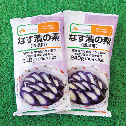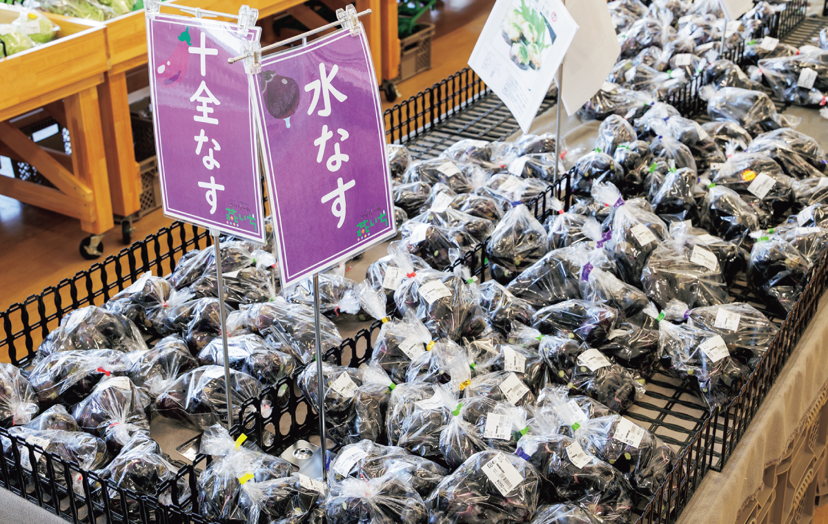 夏から秋にかけ、店内のかなりのスペースを占めるのが「なす」。多彩な品種が並ぶが、同店では特に漬物用の水ナスや十全ナスの人気が高く、Aコープブランドの「なす漬の素」と合わせて買っていく人が多い。水ナスは10月ごろまでシーズンが続く。