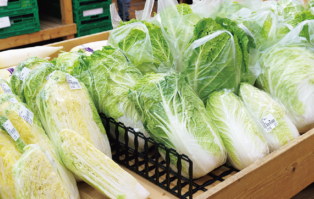 冬の白菜は寒さに当たるほどに甘みを増しておいしくなる。佐渡でも多く生産されていて、最近人気のミニ白菜もたくさん入荷する。「今シーズンの出来栄えもいいと聞いています」と宇佐美店長。