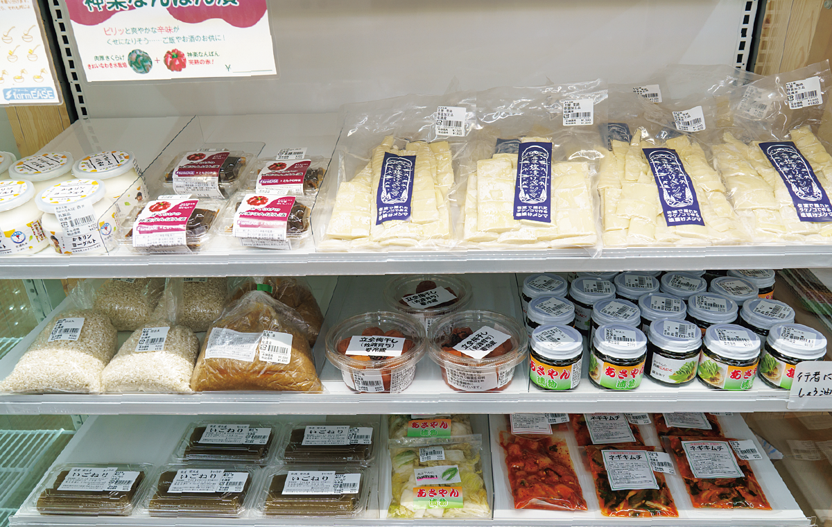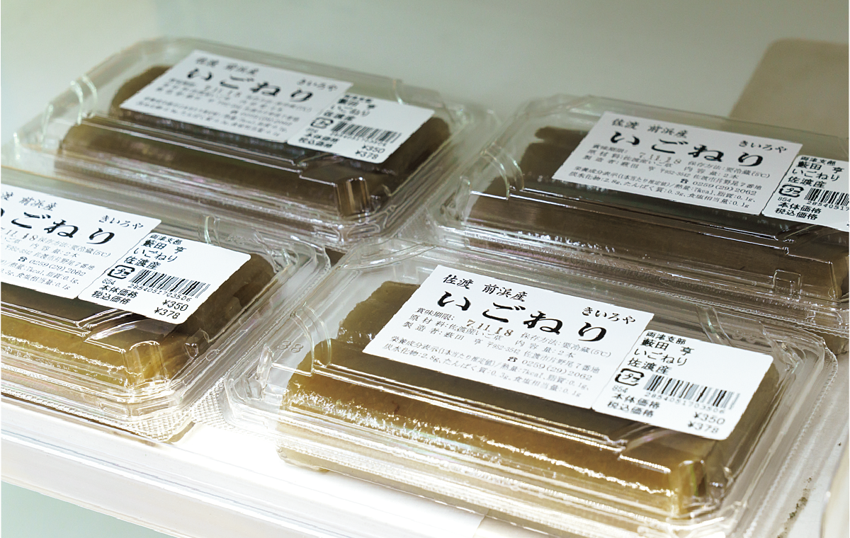 佐渡は山海の幸に恵まれていて、それらの加工品も魅力的なものが揃っている。観光客にも人気だ。佐渡名物の「いごねり」は島内3社のものを販売。柿の加工品も、干し柿、あんぽ柿のほかドライチップスや冷凍柿など多彩。