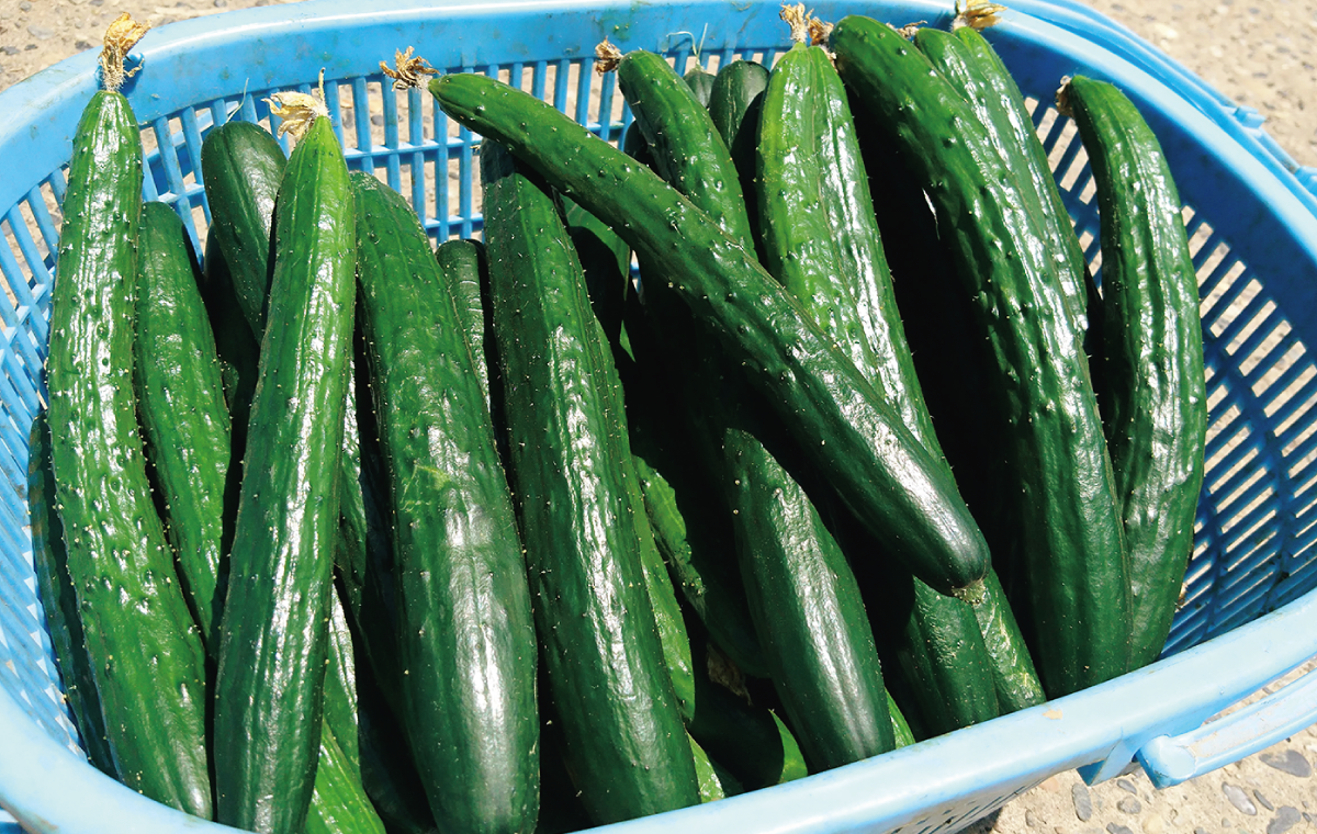 10数棟のハウスを活用し、キュウリ、ミニトマトを栽培。見た目からもみずみずしさが伝わってくる