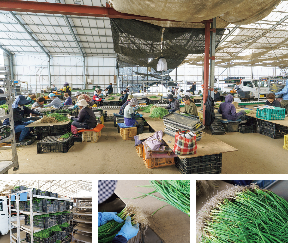 取材に伺った10月上旬は玉ネギ苗の出荷の終盤戦。朝、掘り出した苗を手作業で50本ずつ束ねる。苗の中でも玉ネギが一番手がかかるそうだ