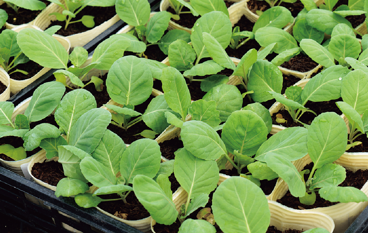 ブロッコリー(左)とキャベツ(右)の苗。春苗は種まきをしておよそ1カ月でポットに移植し、さらに1カ月育てて出荷。秋苗はサイクルが2週間ずつになる