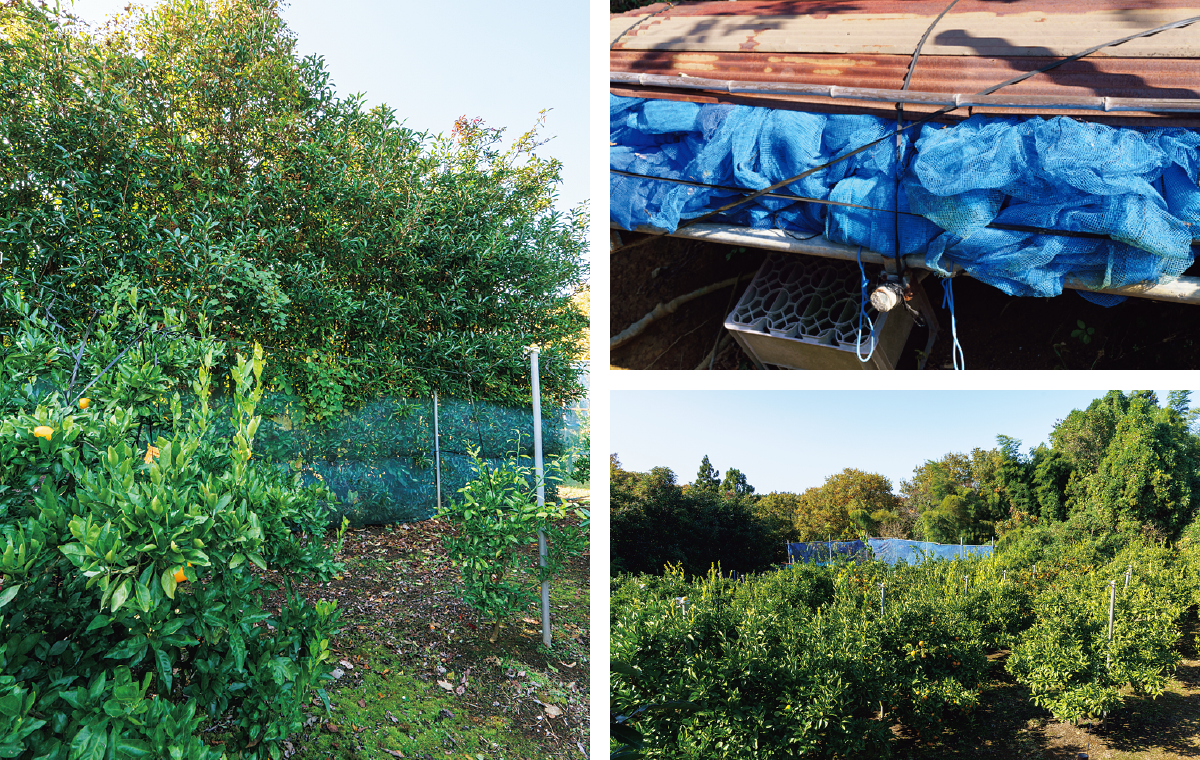 もうひとつ大変なのが冬越し準備。佐渡の風、霜、雪から樹を守るため、支柱を立てて樹全体をネットで覆うという対策を取っている。
